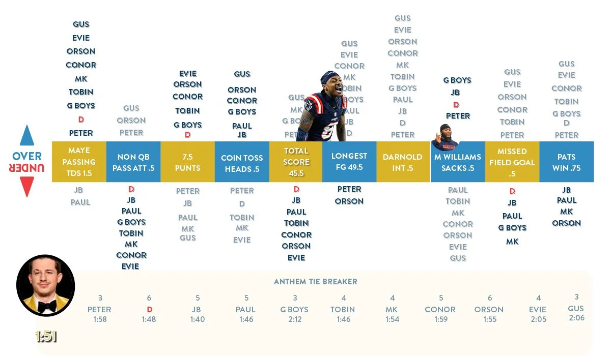 Form must be Submitted and Entry Payment made via Venmo to Peter, @peter-martin-4, before 6:01 pm on Sunday, Feb. 8. The winner(s) will get winnings via Venmo tonight.